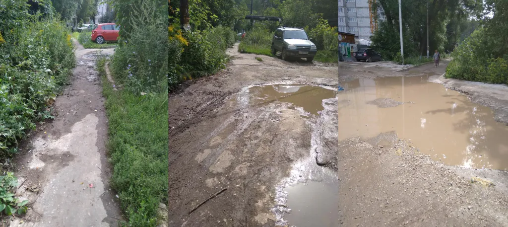 - "Дорога к дому". Приходите в гости, если сможете добраться! Это все дороги к нашему дому, не знаешь, с какой стороны лучше зайти. Как говорится, дорог нет, одни направления. Всю жизнь для пешеходов была одна стёжка, в своё время рады были, что хоть тропинку нам заасфальтировали, а теперь строят новый дом по соседству, так разбомбили всю дорогу, грязь навозили. По факту теперь нет ни дороги, ни тротуара.