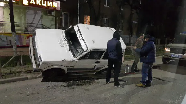 На фотографии видно, что у автомобиля разбито лобовое стекло и с левой стороны отсутствует зеркало. Возле автомобиля собралось много людей. Никто из них не знал, как машина смогла очутиться на заборе.