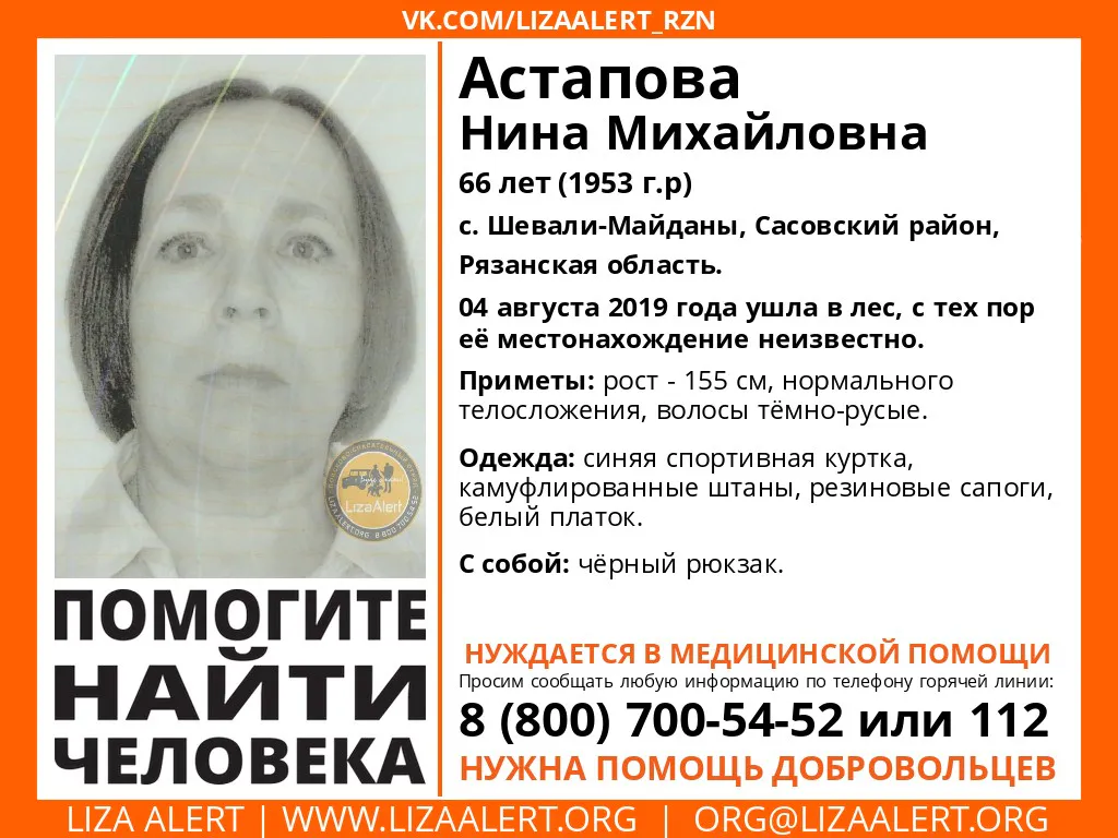 4 августа 2019 года Нина Астапова ушла в лес, с тех пор о ее местонахождении ничего неизвестно. Женщина нуждается в медицинской помощи.