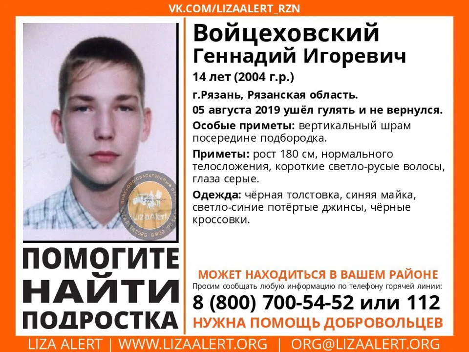 Волонтеры ПСО "Лиза Алерт Рязань" ищут пропавшего Геннадия Войцеховского. 14-летний подросток ушел гулять и не вернулся. О его местонахождении ничего неизвестно с 5 августа.