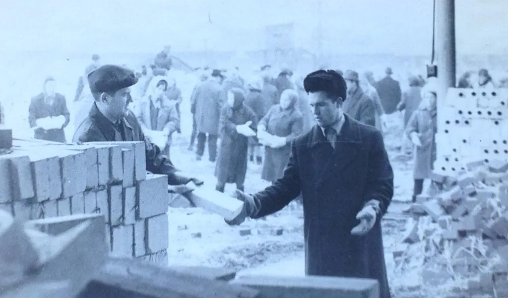 1960 г. Мой папа на субботнике. Строительство дома работникам завода ТКПО.