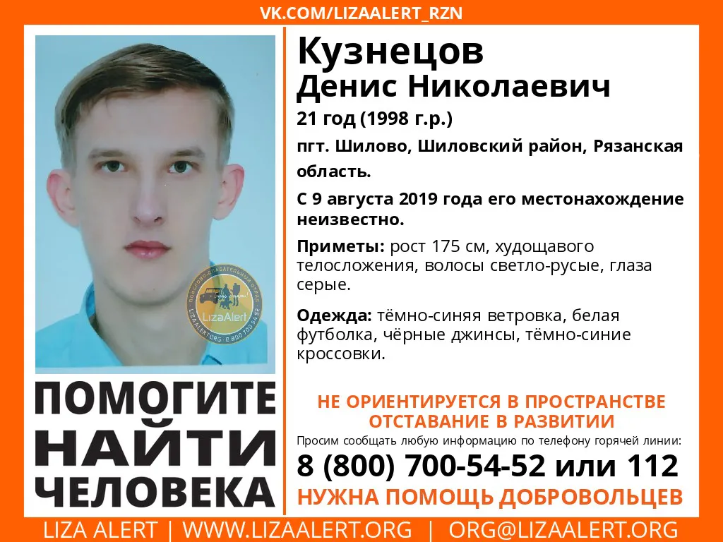 Волонтеры ПСО "Лиза Алерт Рязань" просят помощи в поисках пропавшего Дениса Кузнецова. О местонахождении 21-летнего жителя города Шилово ничего неизвестно с 9 августа. Молодой человек не ориентируется в пространстве и может нуждаться в медпомощи.
