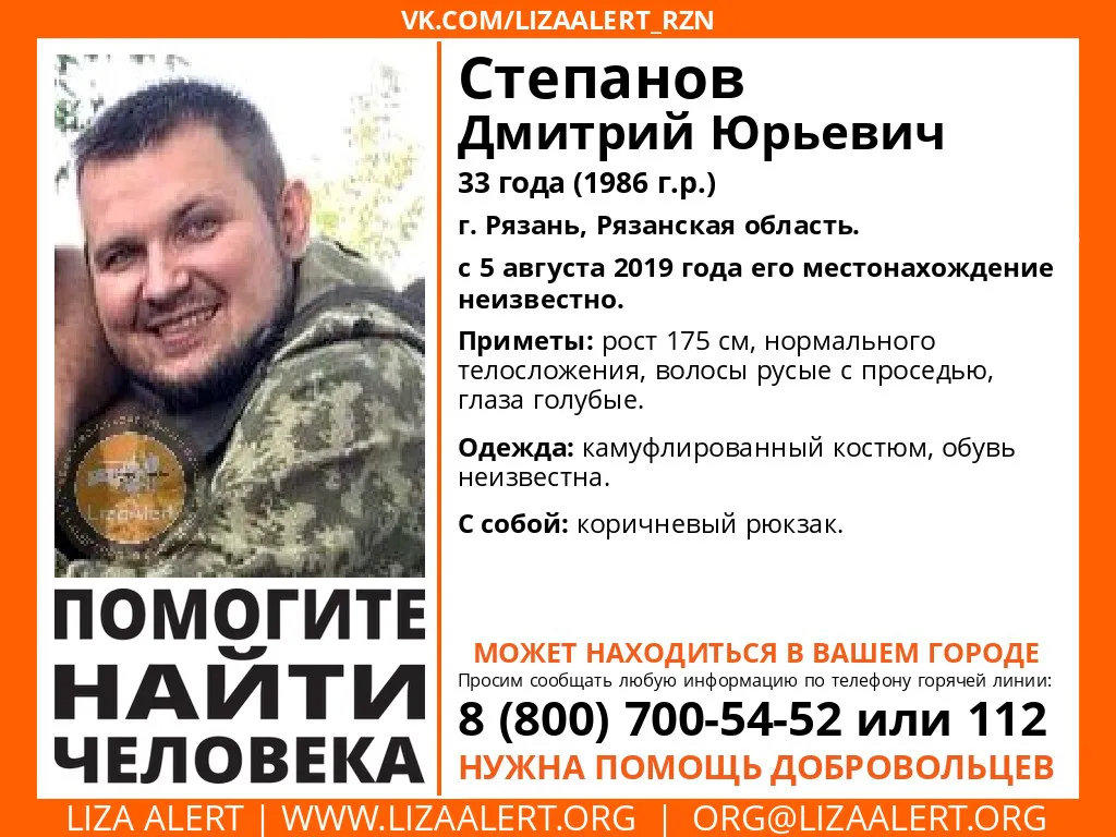 Волонтёры спасательного отряда Liza Alert Рязань обьявили о поиске 33-х летнего Дмитрия Степанова. Известно, что мужчина пропал 5 августа.
