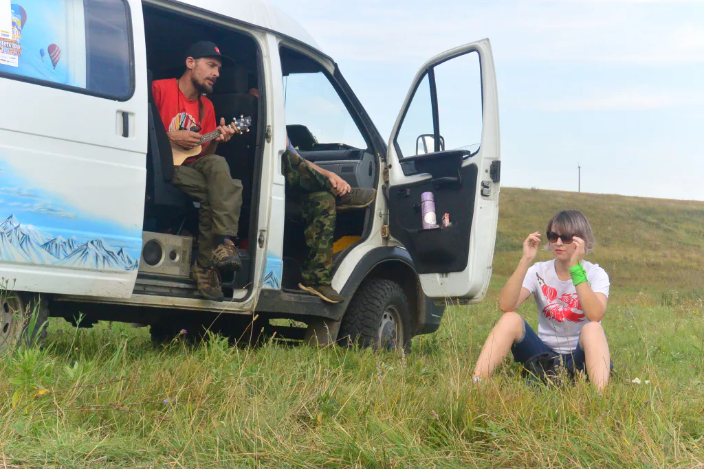 Так я познакомилась с милой собачкой Черри, которая носилась по всему полю и ловко уворачивалась от меня, желавшей ее погладить, а также со многими другими людьми. Тут же скучали и другие журналисты, которые отсняли уже все, что можно было, и теперь терпеливо ждали полетов. Мне скучно не было - я слушала, как Миша играет на укулеле, и вместе с ним поет еще одна девушка. Вообще сложилось впечатление, что все здесь друг с другом знакомы тысячу лет.