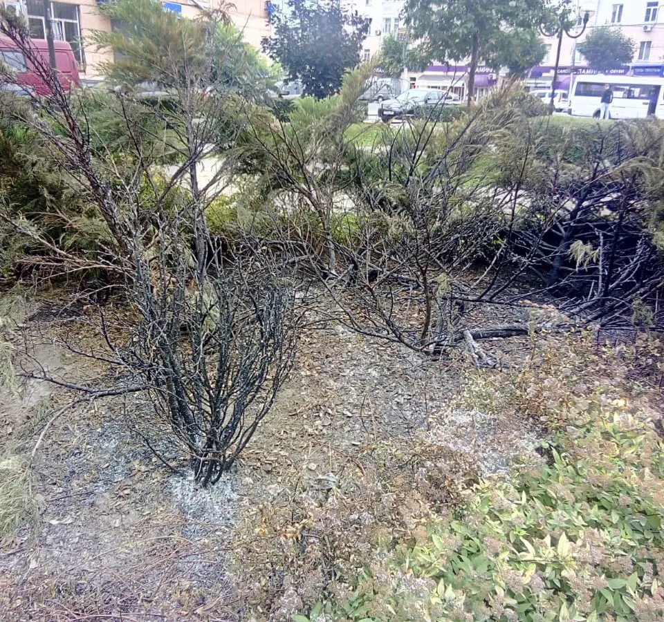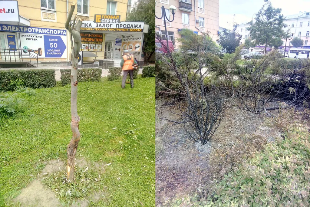 Судя по фотографиям, иву нещадно обкорнали, а можжевельник попросту сожгли. Дирекция благоустройства города пишет заявление в полицию, а Управление благоустройства подсчитывает ущерб.