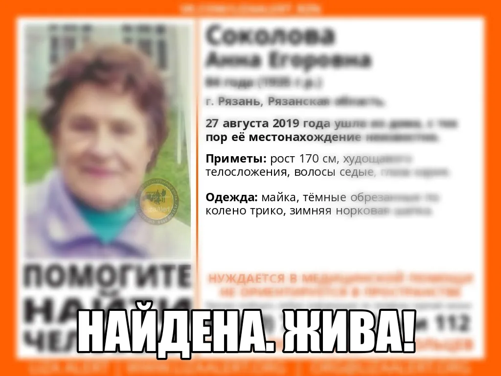 Подробности поисков женщины не разглашаются. Напомним, 84-летняя рязанка ушла из дома 27 августа. Поиски осложнялись тем, что рязанка не ориентировалась в пространстве и нуждалась в медицинской помощи.