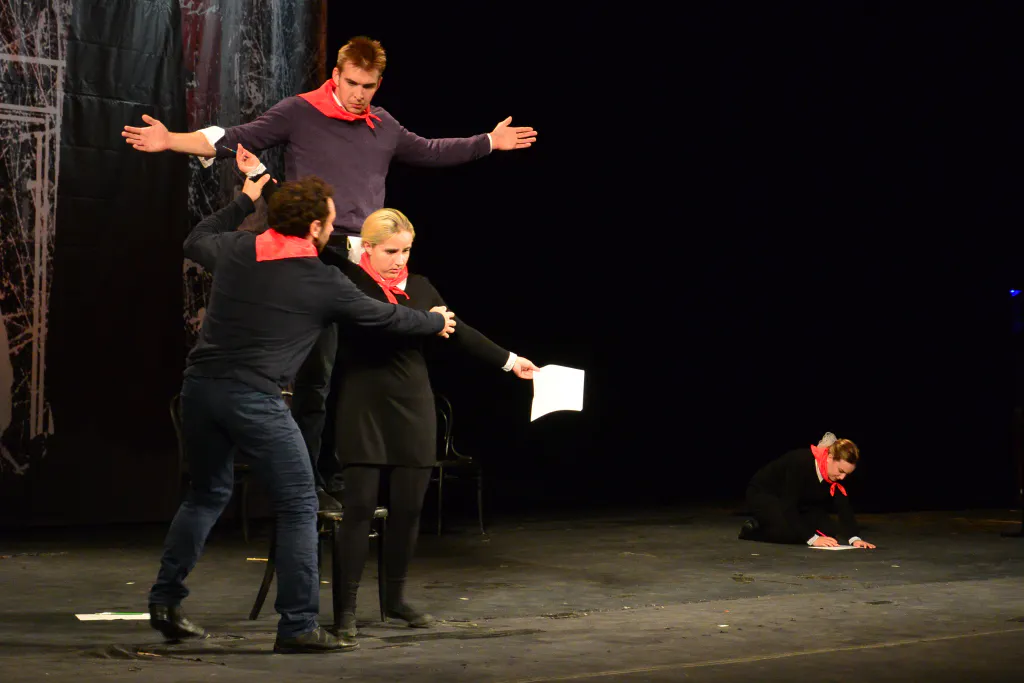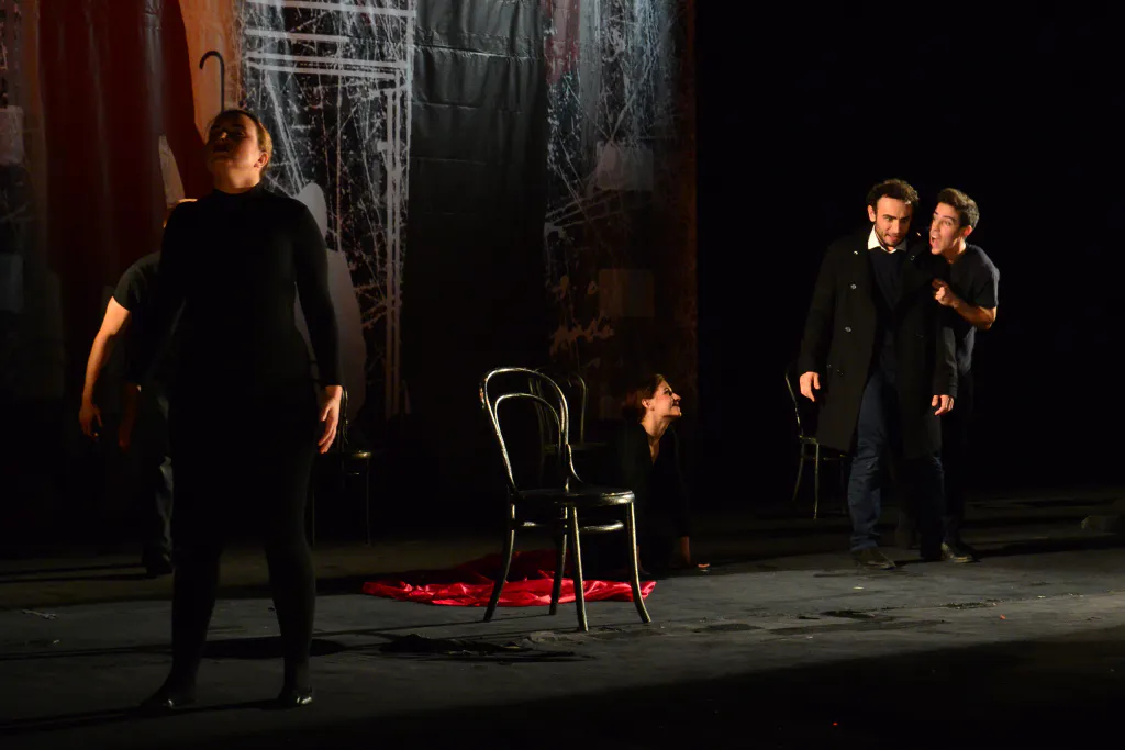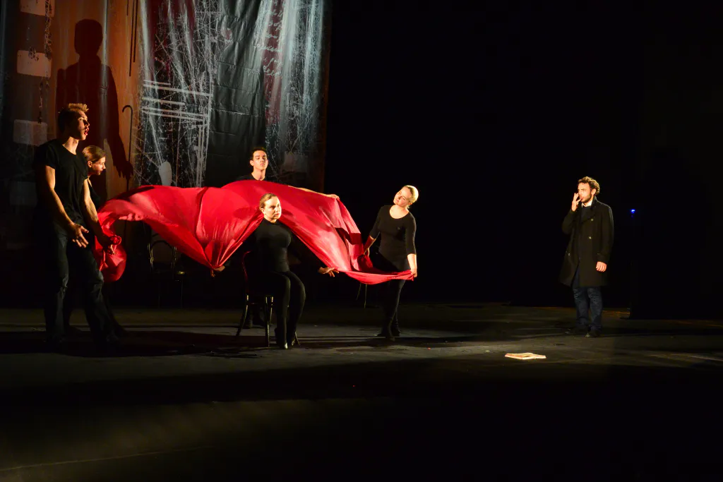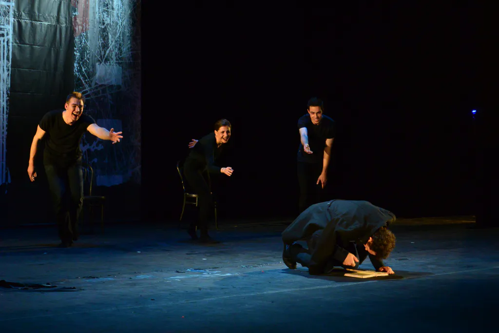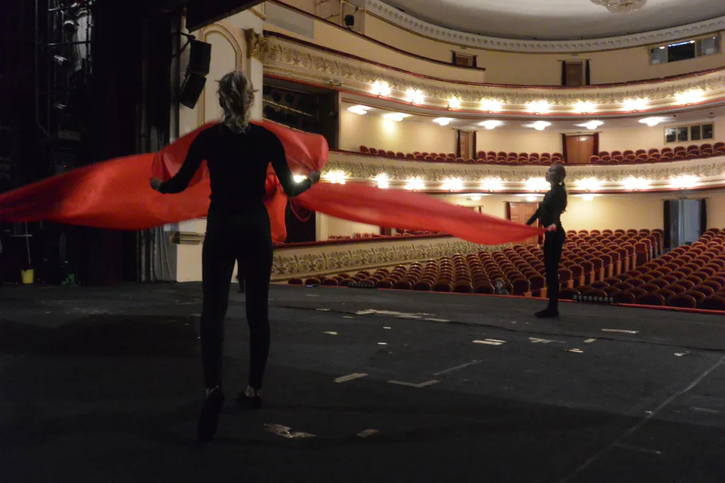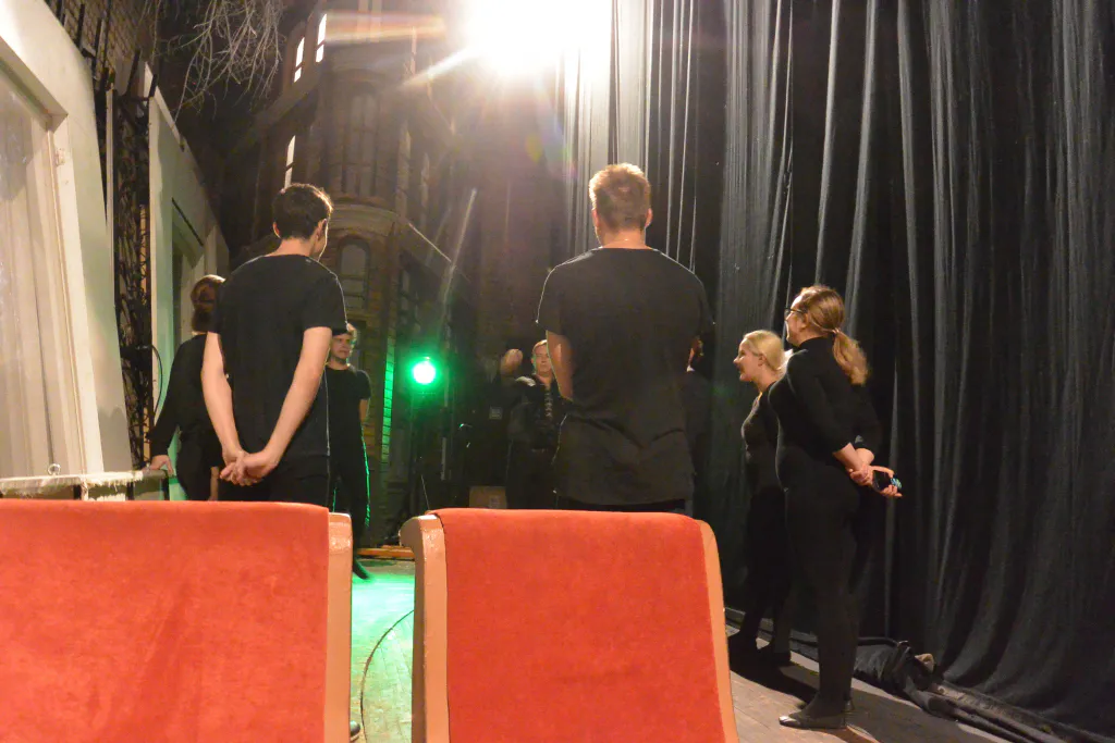 Разминка оказалась не только физической: для актеров важна и пластика, и дикция. Собравшись в кружок за сценой, они громко и отчетливо повторяют скороговорки. До этого на сцене порхали девушки в одинаковых темных костюмах – репетировали танец, открывающий спектакль.