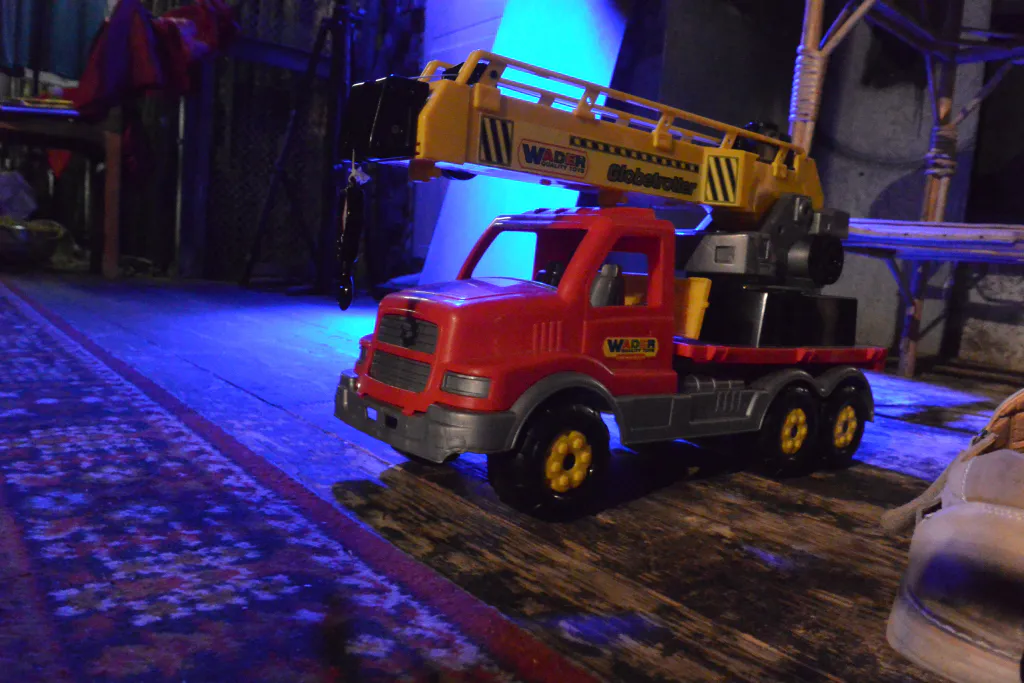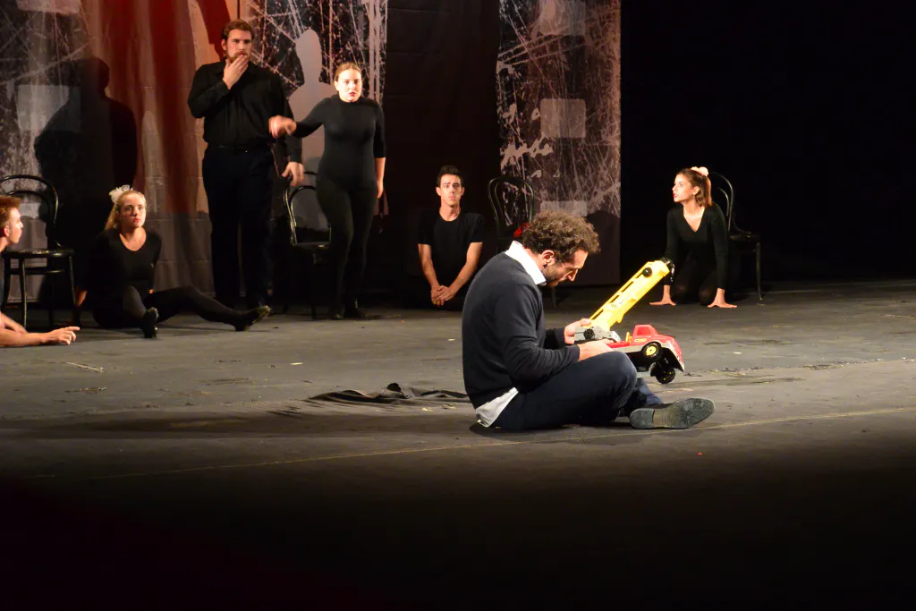 Пока мы бродили за кулисами, нам встретились неожиданные предметы, которые, казалось бы, попали сюда совершенно случайно: чьи-то учительские на вид туфли, игрушечный самосвал, ростовая кукла медведя, куча воздушных шариков… Вскоре выяснилось, что все это – тоже реквизит, хотя обычно с реквизитом ассоциируются яркие маски, пышные костюмы и бутафорские пистолеты. Но и они, кстати, тоже были в спектакле.