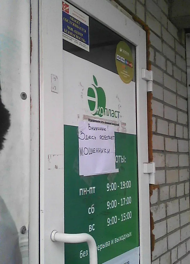 Корреспондент газеты Progorod62 решил лично проверить, начнет ли работу офис компании 28 апреля. Как оказалось – нет. Офис закрыт, а на дверь приклеен листок с надписью: «Внимание! Здесь работают мошенники!». На сайте компании говорится, что деятельность фирмы приостановлена. Номер телефона для связи отсутствует. Между тем, в интернете негативных отзывов о работе компании «Экопласт» - множество. В разных городах России люди ждут свои окна уже по полгода, а офисы компании закрываются на неопределенные сроки.