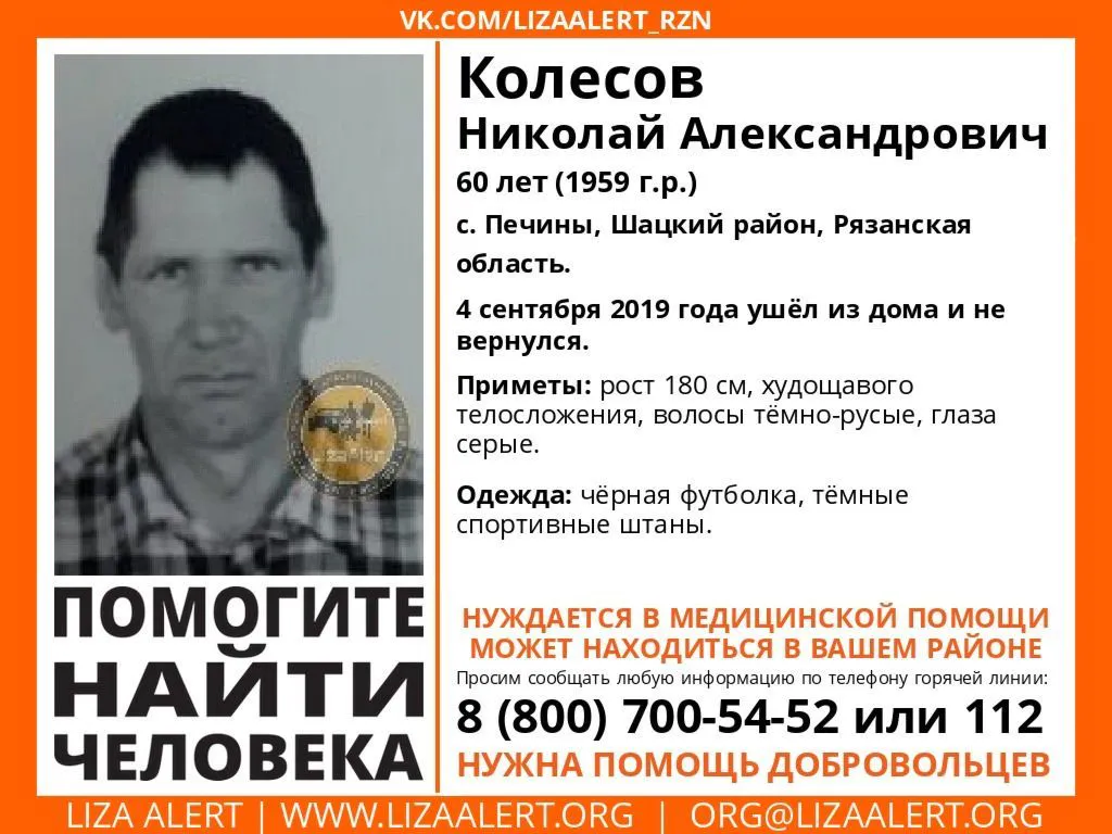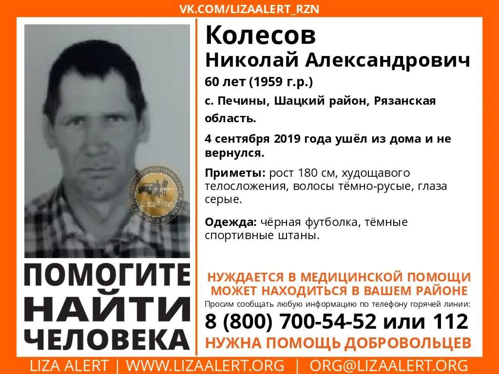 Волонтеры ПСО "Лиза Алерт Рязань" просят помощи в поисках 60-летнего Николая Колесова - жителя села Печины Шацкого района. Пенсионер ушел из дома 4 сентября, и с тех пор его местонахождение неизвестно.