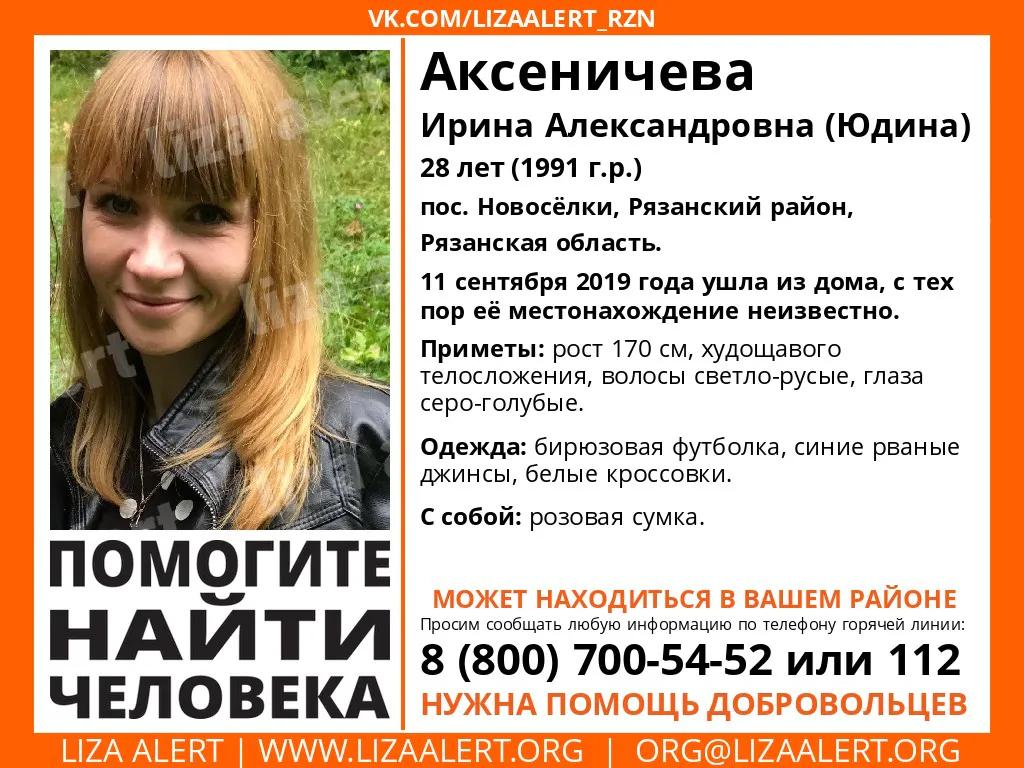 Ирина Аксеничева (Юдина) пропала в поселке Новоселки Рязанского района. 11 сентября она ушла из дома, с тех пор ее местонахождение неизвестно.