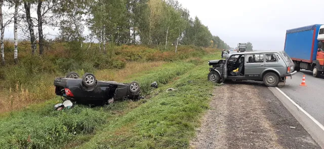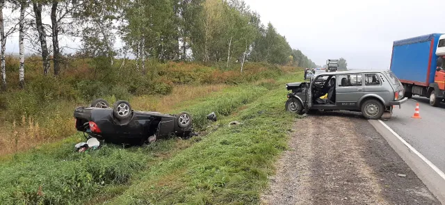 Авария произошла примерно в 7 утра. По предварительной информации, молодой человек на "Шевроле" врезался в "Ниву". От удара иномарка опрокинулась в кювет.