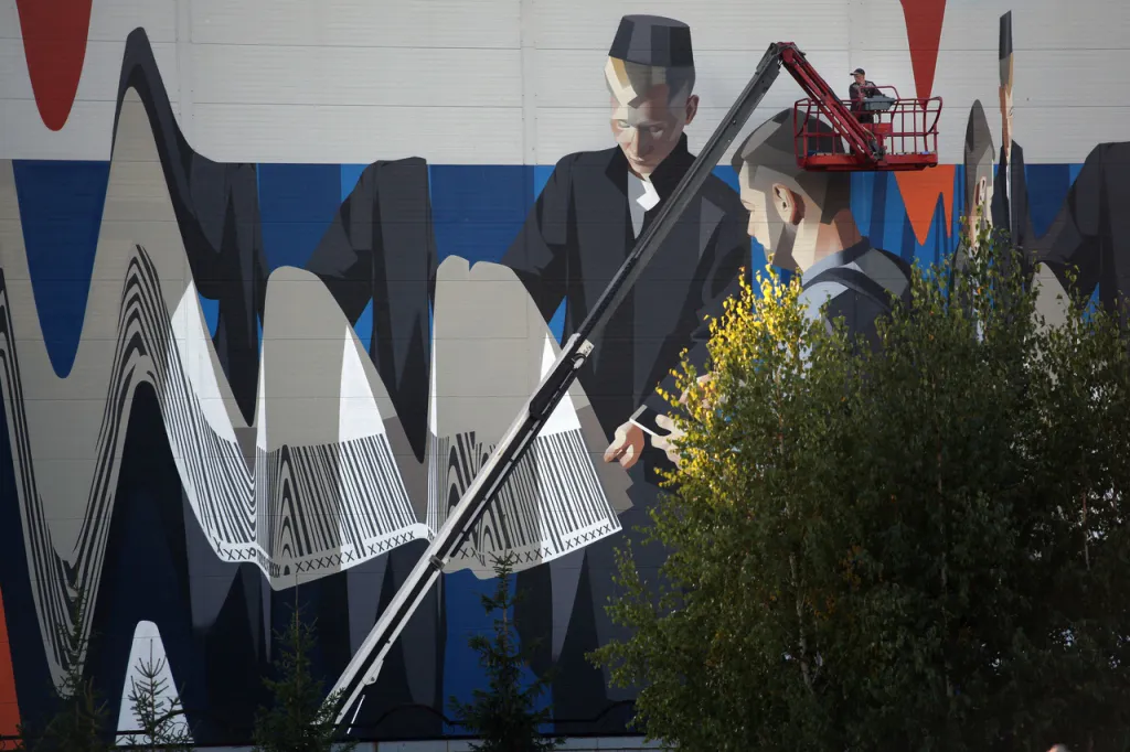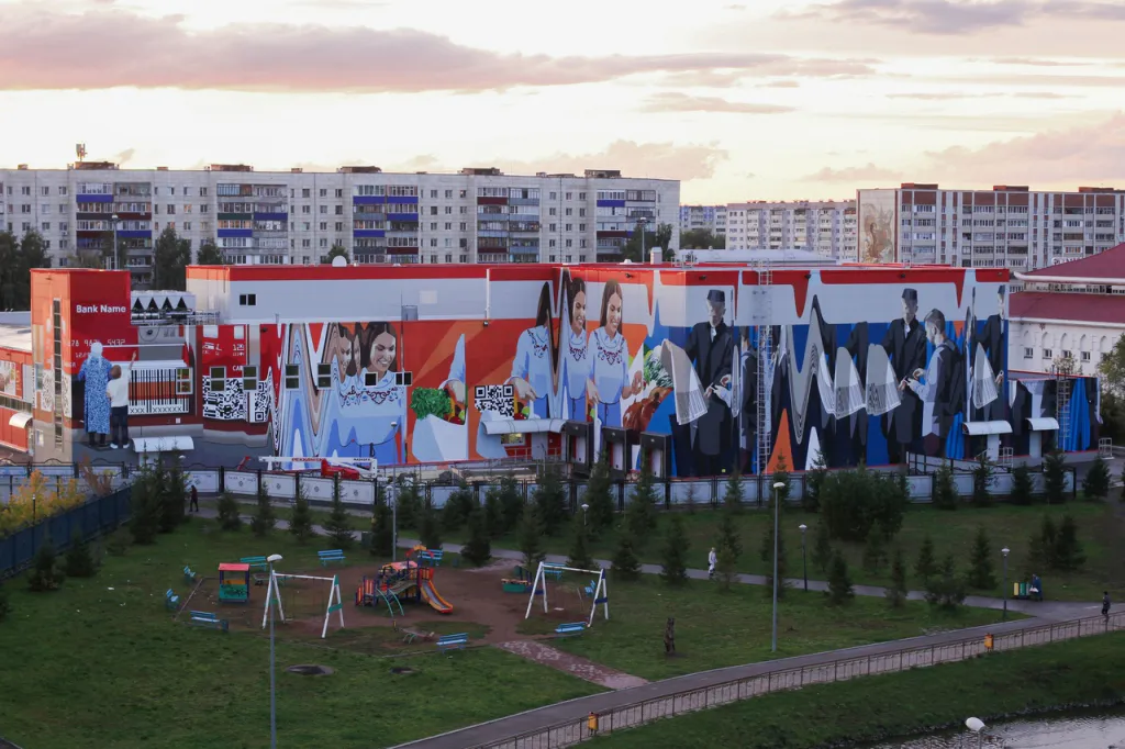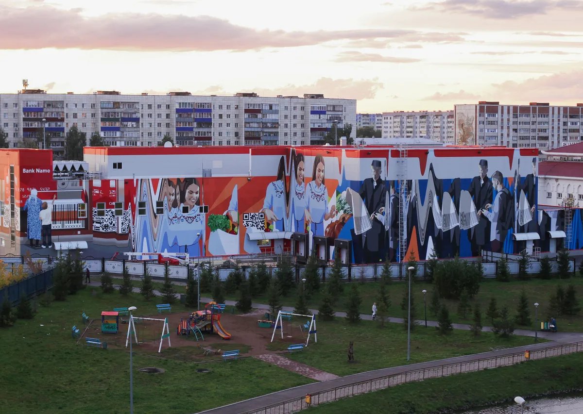 Площадь граффити составляет 1 500 квадратных метров. Работа выполнена в рамках проекта "Сказки о золотых яблоках" - пятилетней паблик-арт программы в Альметьевске. Работа "Без контакта" - мурал, то есть, согласованный полноценный рисунок.