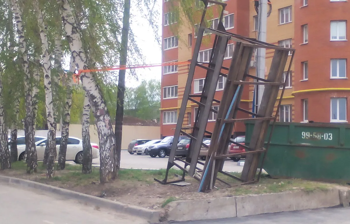 В Рязани на улице Вишневой к дереву привязана железная конструкция, мимо ходят люди, рядом играют дети. От падения железку удерживает трос, который кто-то привязал к одной из перекладин. Как progorod62 сообщил автор фото Иван Сидоров, подобные конструкции используются для перевозки окон: