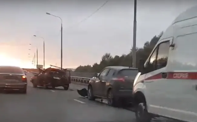 На записи видно, что два автомобиля получили сильные повреждения и полностью заняли полосу движения. Возможно есть пострадавшие, на место ДТП приехала скорая помощь. По словам очевидца, из-за аварии образовалась большая пробка.