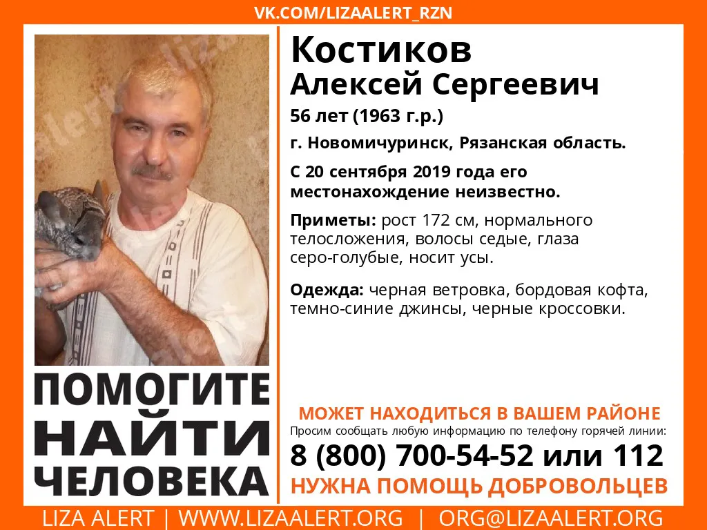 Волонтеры поисково-спасательного отряда "Лиза Алерт Рязань" ищут 56-летнего жителя Новомичуринска.  Алексей Костиков исчез 20 сентября, и до сих пор о пропавшем нет никаких вестей.