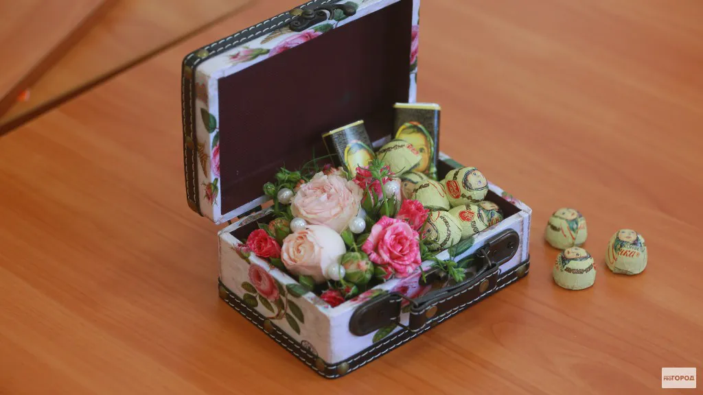 В данном видеоуроке Елена декорировала маленькую коробочку в виде сундучка. Для этого ей понадобились живые цветы, конфеты и сладости. Также вы можете заменить конфеты ягодами или даже живыми бабочками.