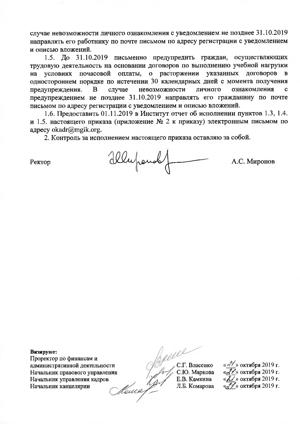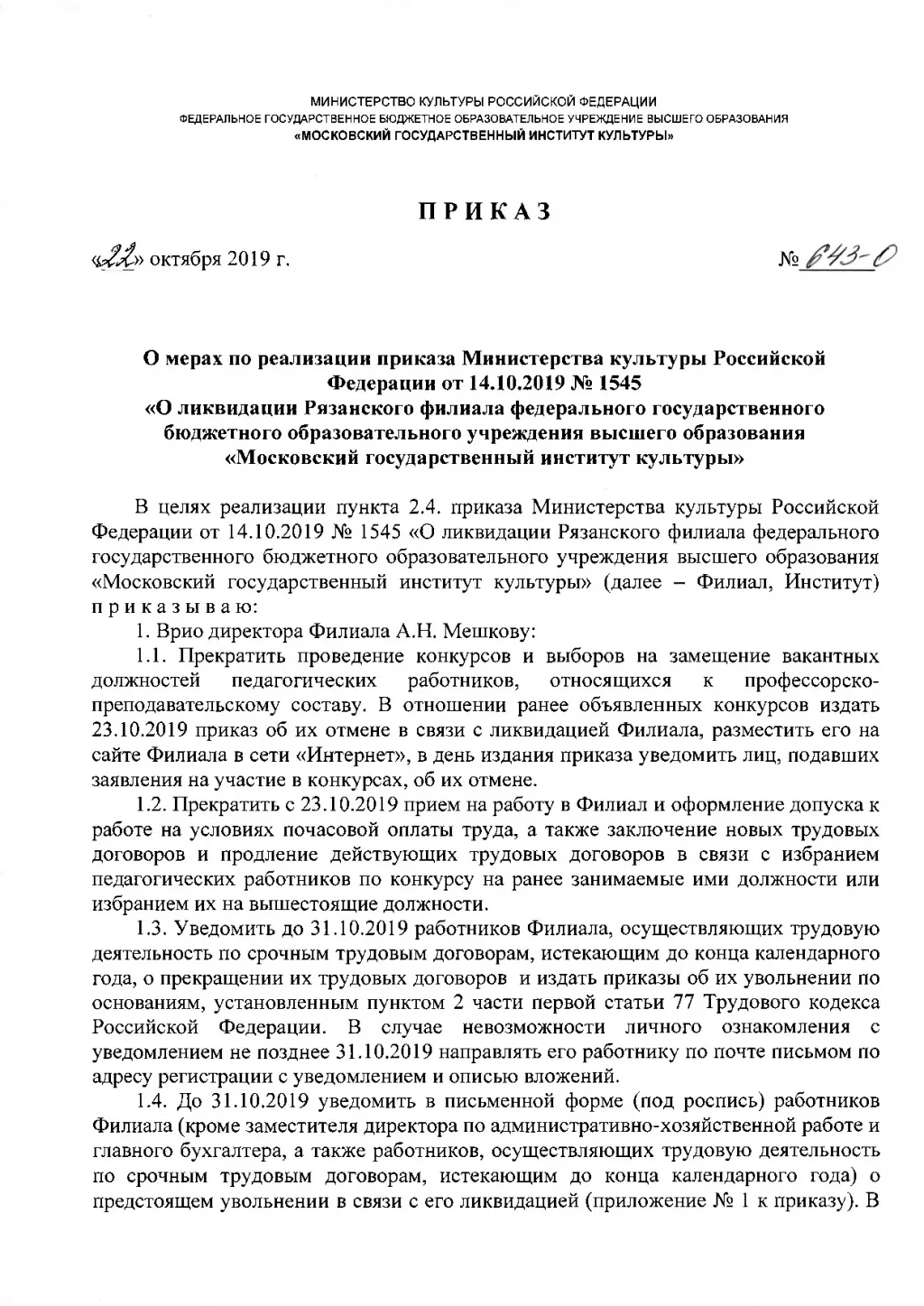 В приказе говорится, что с 23 октября вуз прекращает принимать сотрудников на работу. Кроме того, до 31 октября всех сотрудников уведомят об увольнении и в течение 30 дней освободят от должностей.