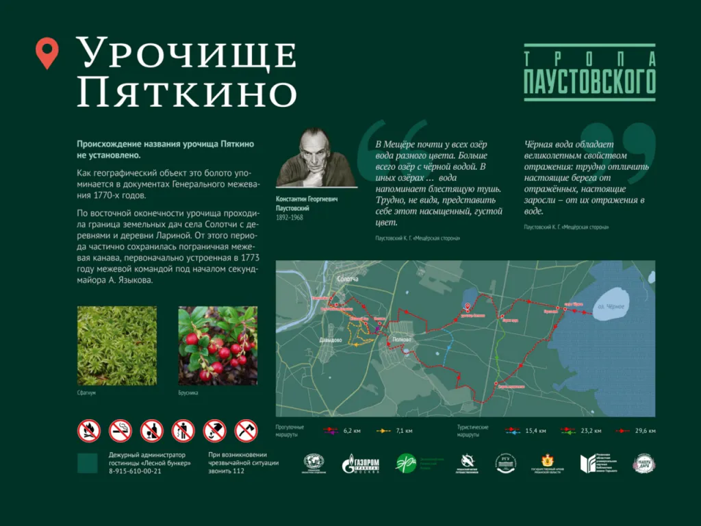 Рязанцев приглашают пройтись по солотчинским тропинкам, которые когда-то вдохновляли Константина Паустовского на создание новых шедевров. Маршрут тянется от дома-музея Пожалостина до озера Чёрного. На этом пути можно увидеть несколько мест, которые попали в произведения Константина Георгиевича: