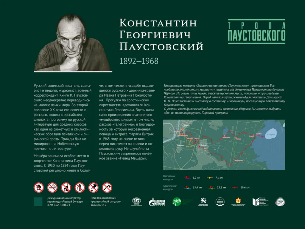 С учетом своей физической подготовки и состояния здоровья можно выбрать один из пяти маршрутов. Перед началом пути рекомендуем посетить Дом-музей И. П. Пожалостина и выставку в гостинице «Боровница», посвященную Константину Паустовскому. Хорошей прогулки!