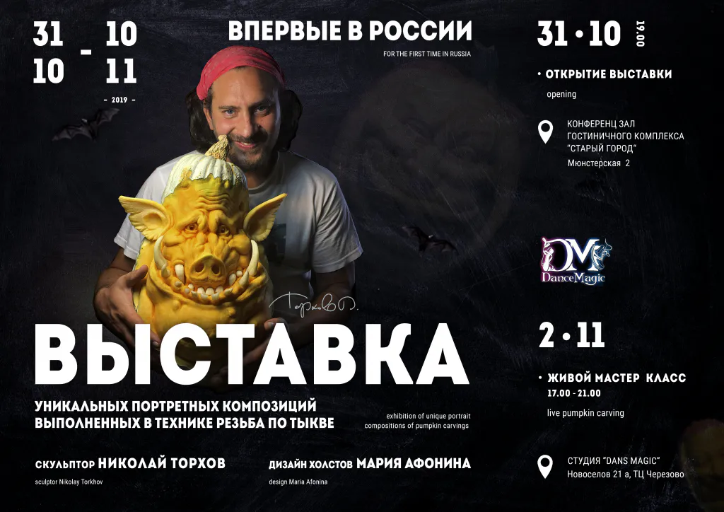 Открытие состоится 31 октября в 17:00  в гостинице "Старый город". В день открытия ма­стер-класс Live Pump­kin Carving - живая резьба по тыкве, кот­орый проведёт скульптор Николай Торхов. Творческие работы Николая находятся в частных коллекциях в России и за рубежом.