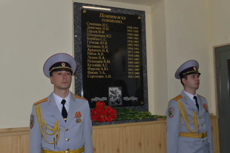 В Управлении уголовного розыска УМВД РФ по Рязанской области открыли мемориальную доску, посвященную сотрудникам полиции, которые погибли при исполнении служебного долга. Честь открыть доску оказали Герою Советского союза Сергею Лебедеву, генерал-майору милиции в отставке Юрию Плугину и полковнику милиции в отставке Александру Толченкину.