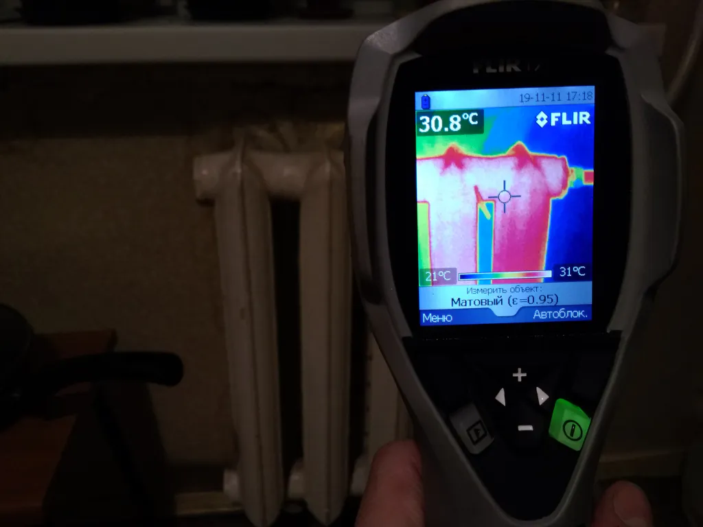Я психанул, взял с работы дорогущий тепловизор и зафиксировал температуру теплоносителя в радиаторах. 11 ноября 2019 года, температура воздуха на улице была +7 - это по информации Росгидрометцентра. По положению Госстроя, температура теплоносителя должна быть 43/46 градусов. Судя по моим показаниям, у нас явный недогрев. К тому же, как я уже говорил, когда на улице околонулевая температура, они греют так же! Как вы думаете, радиаторы с такой температурой могут нормально отапливать? Конечно же, нет. И это ещё нет морозов. Я снова отправил жалобы в Жилинспекцию и РМПТС, пусть люди работают. Но доверия к ним, а тем более уверенности в результате у меня нет.