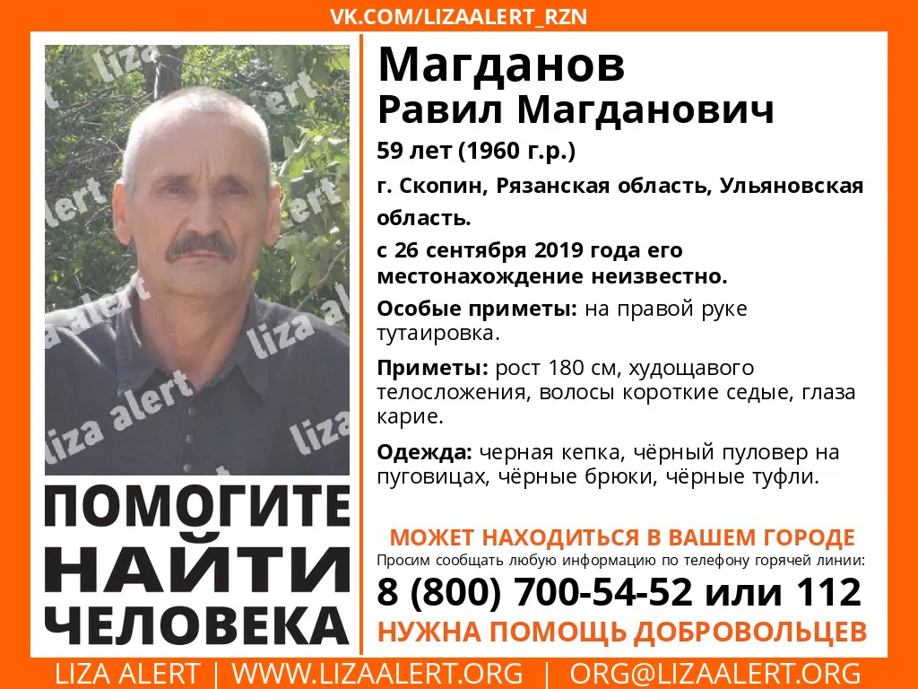В Скопине ищут пропавшего 59-летнего Равила Магданова. Об этом сообщили активисты поисково-спасательного отряда "Лиза Алерт".