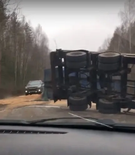 По словам очевидца, авария случилась в районе Тумы. На видеозаписи видно, что из-за столкновения две фуры перевернулись.