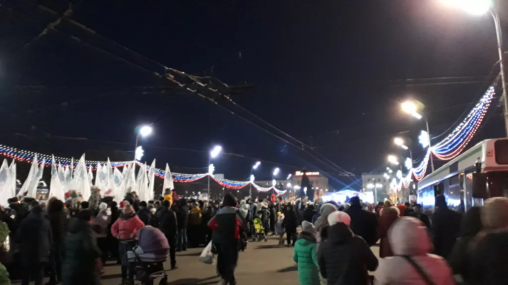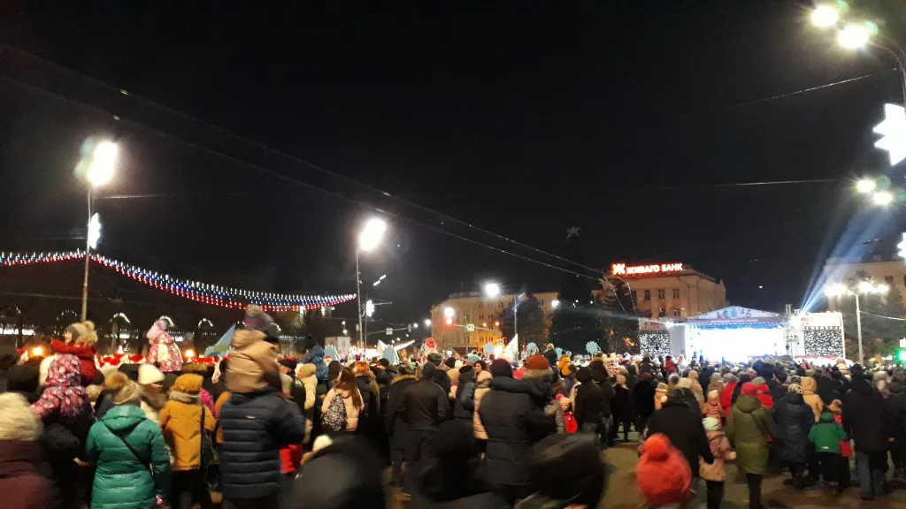 Губернатор области Николай Любимов поздравил рязанцев с открытием Новогодней столицы. На площади запустили пиротехнические фонтаны, а также выполнили хором классическое : "Елочка, гори!". Помимо музыкальных и танцевальных номеров рязанцам показали лазерное шоу, после которого пустили искусственный снег. Дед Мороз напустствовал гостей: