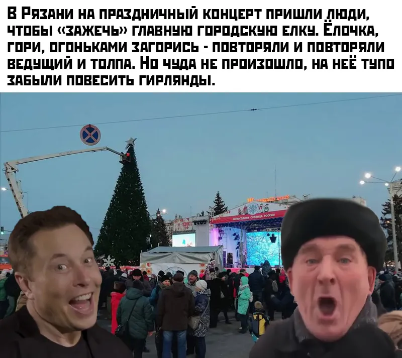- В Рязани на праздничный концерт пришли люди, чтобы зажечь главную городскую елку. Елочка гори, огоньками загорись — повторяли и повторяла ведущий и толпа. Но чуда не произошло, на нее тупо забыли повесить гирлянды, - написали в группе.