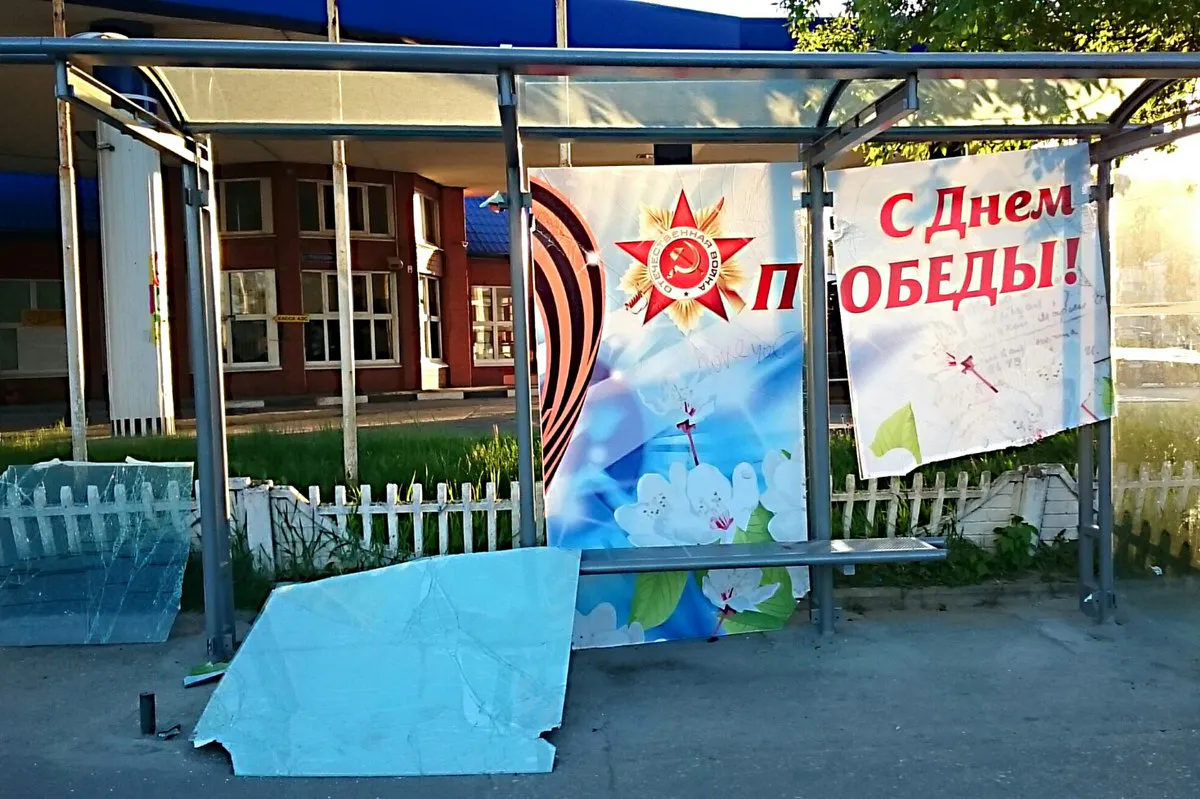 В Рязани вандалы разрушили остановку на ул. Есенина, украшенную ко Дню Победы. Разбиты стекла, одна часть конструкции обрушилась на землю, кусок второй и вовсе пропал. Фотография погрома появилась в сообществе "Типичная Рязань".