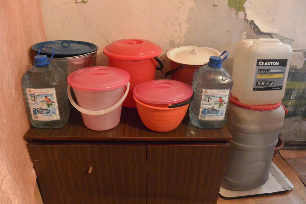 Ольга приглашает в дом. Первое, что бросается в глаза на входе - две шеренги ведер и баклажек в прихожей.