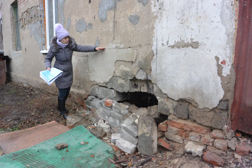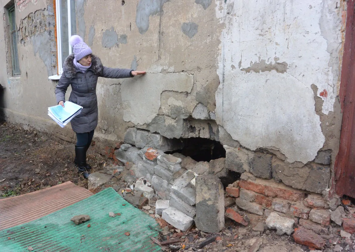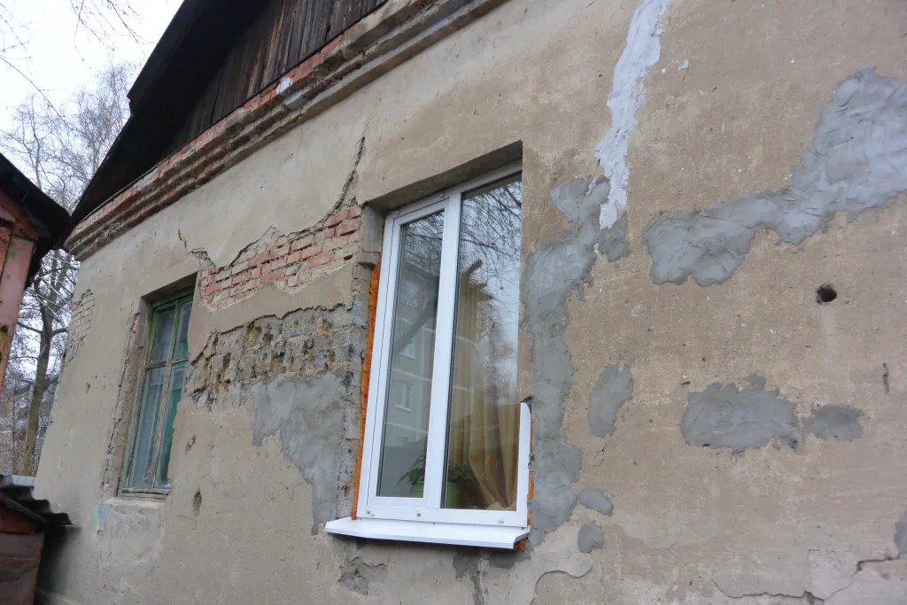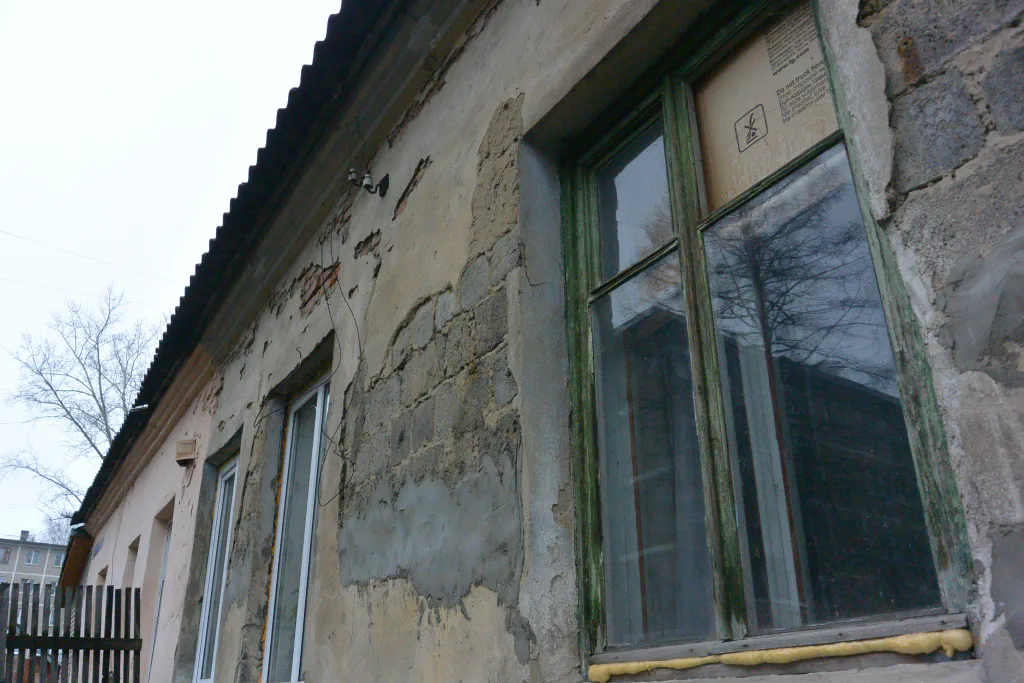Словно в подтверждение своих слов она демонстрирует немалую дыру в фундаменте и трещины в стенах. Кое-где сохранились остатки голубой краски - раньше дом наверняка выглядел намного симпатичнее. Некоторые трещины замазаны, но это, по словам Ольги, было уже давно. Женщина рассказывает: она уже не раз обращалась за помощью к администрации города, но ей сообщили, что средств на ремонт нет.