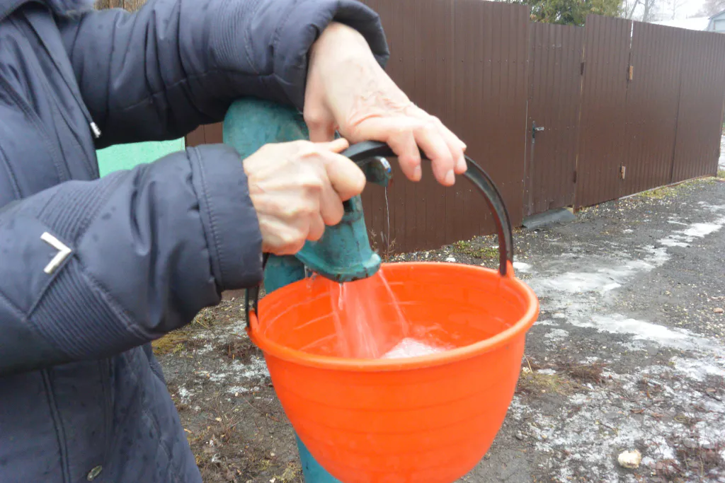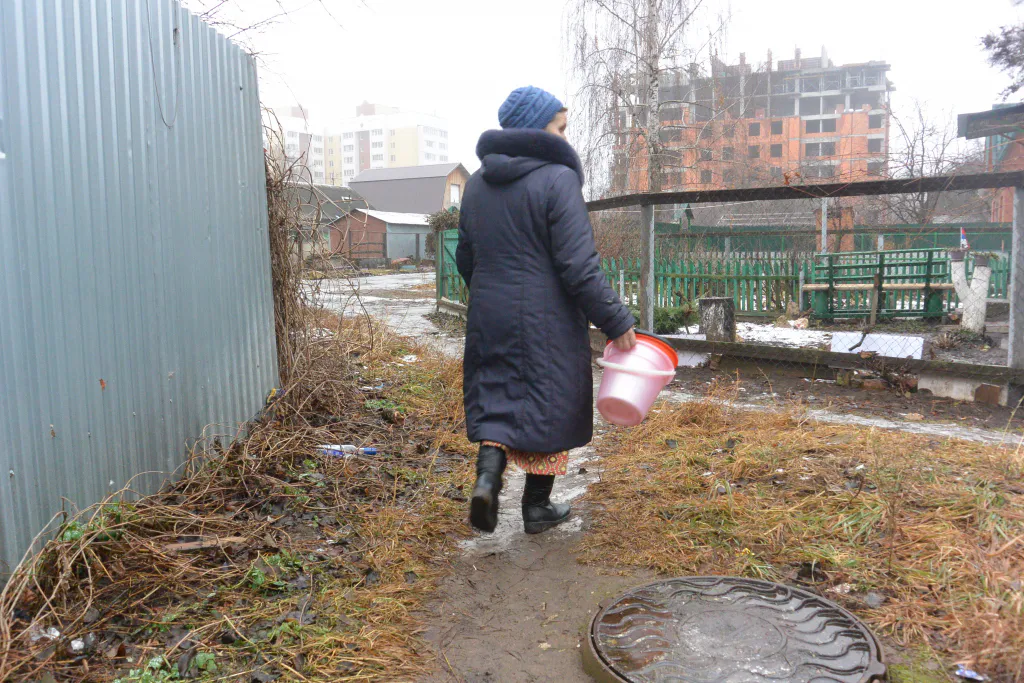Путь на колонку действительно оказывается непрост. Вместе с Ниной Ивановной берем ведра и идем за водой по узким, грязным и заледеневшим тропинкам. Возвращаться - еще труднее: ноги скользят по льду, а ведра, пусть и небольшие, ощутимо оттягивают руки. Канализации в доме, кстати, тоже нет.
