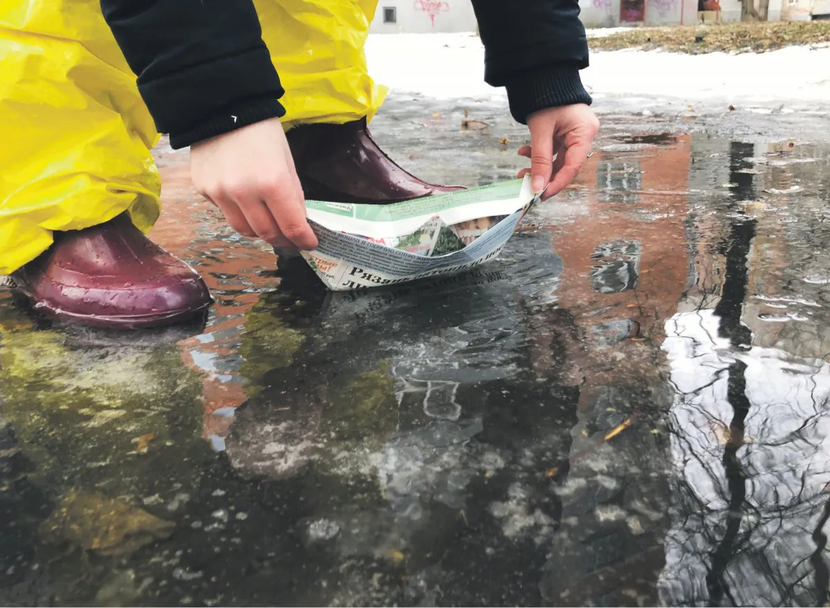 Для того, чтобы снять эту фотографию, мы нашли самую огромную лужу на Диком Западе - то есть, в сквере рядом с редакцией. Для снимка нужно было вспомнить детство и соорудить из газеты бумажный кораблик - предполагалось пустить его плавать в луже. Оказалось, что детство почему-то лучше всех помнит самый старший сотрудник из отдела корреспондентов. Кораблик пришлось складывать именно ему (да, нам за это еще и деньги платят).
