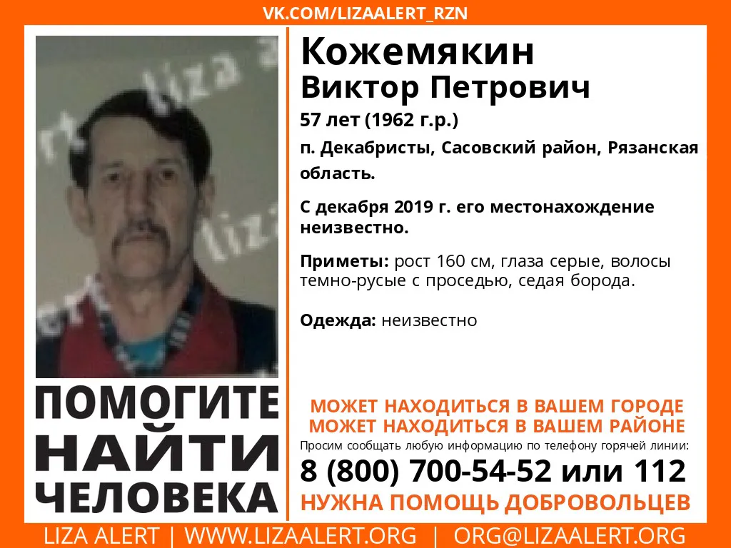 В Рязанской области разыскивают 57-летнего жителя поселка Декабристы Сасовского района Виктора Кожемякина. Как сообщают волонтеры поисково-спасательного отряда Лиза Алерт, мужчина пропал около месяца назад.
