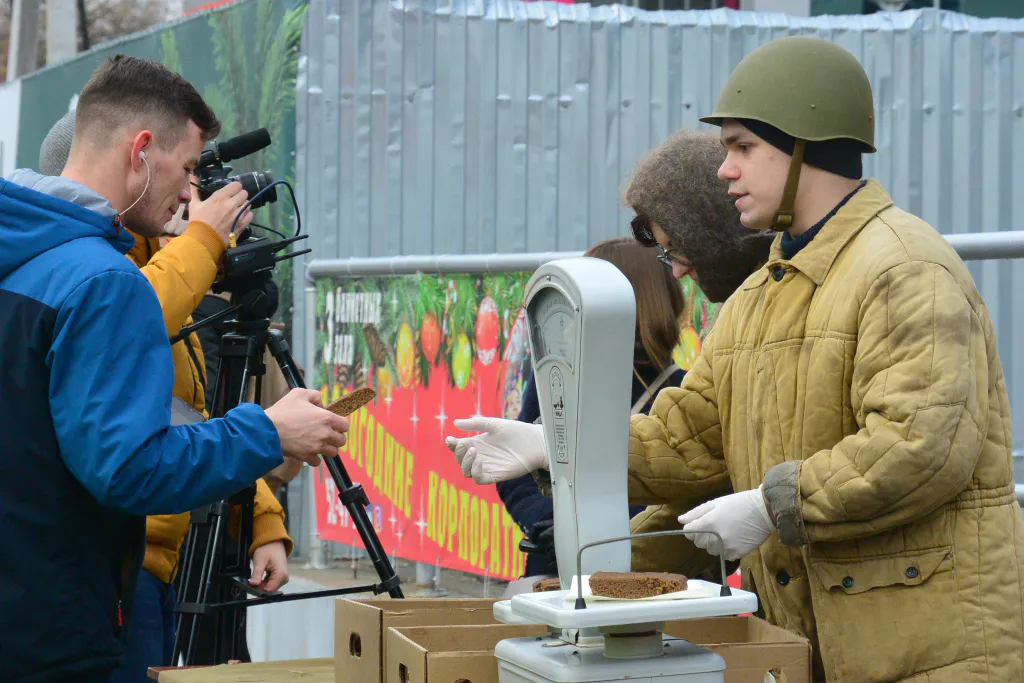 Хлеб раздавали перед МКЦ. Пришли и взрослые, и дети. Мероприятие открыли минутой молчания. Ведущие зачитали жуткие цифры - сколько человек погибли в Ленинграде во время блокады. Напомнили, что большая часть скончалась от голода. Озвучили собравшимся рецепт блокадного хлеба - соевая мука, отруби, целлюлоза, отбойная пыль, опилки из древесины. Пока организаторы, одетые в костюмы военного времени, раздавали всем желающим хлеб, со сцены читали стихи о блокадном Ленинграде.