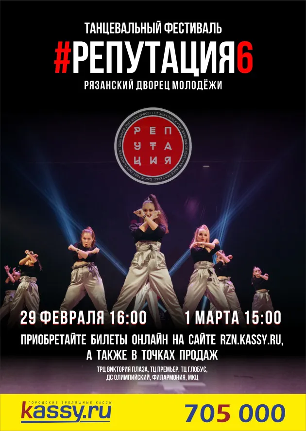 29 февраля и 1 марта в Рязани пройдет фестиваль РЕПУТАЦИЯ, в котором примут участие 2000 танцоров из 55 городов. Фестиваль пройдет в шестой раз и является крупнейшим событием региона в нише современной хореографии.