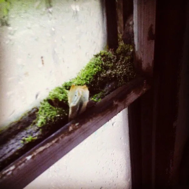 Шел дождь, и некоторые сидения были мокрые, потому что на них капало сверху. Поэтому я встала на задней площадке троллейбуса у окна и увидела - мох!