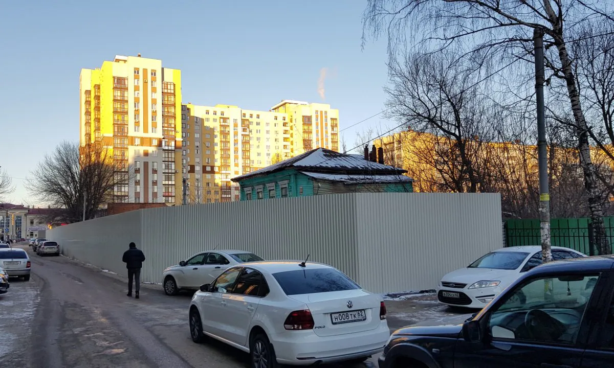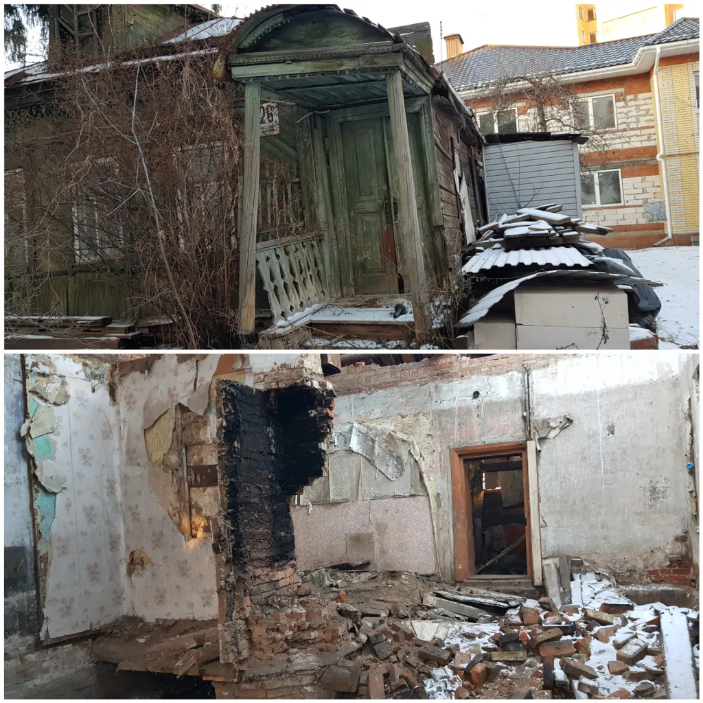 Двигаемся вдоль забора и попадаем на пешеходную улицу. Там теперь еще один забор. Каждый рязанец знает, что этот забор прикрывает полуразрушенные дома безобразного вида. Если обойти вокруг, то можно увидеть жутковатые заброшенные дома, которые некогда радовали глаз резными наличниками и архитектурой 19-го века. Тут какждый прохожий с головой погружается в декорации забытой богом деревни, затерянной в глуши.