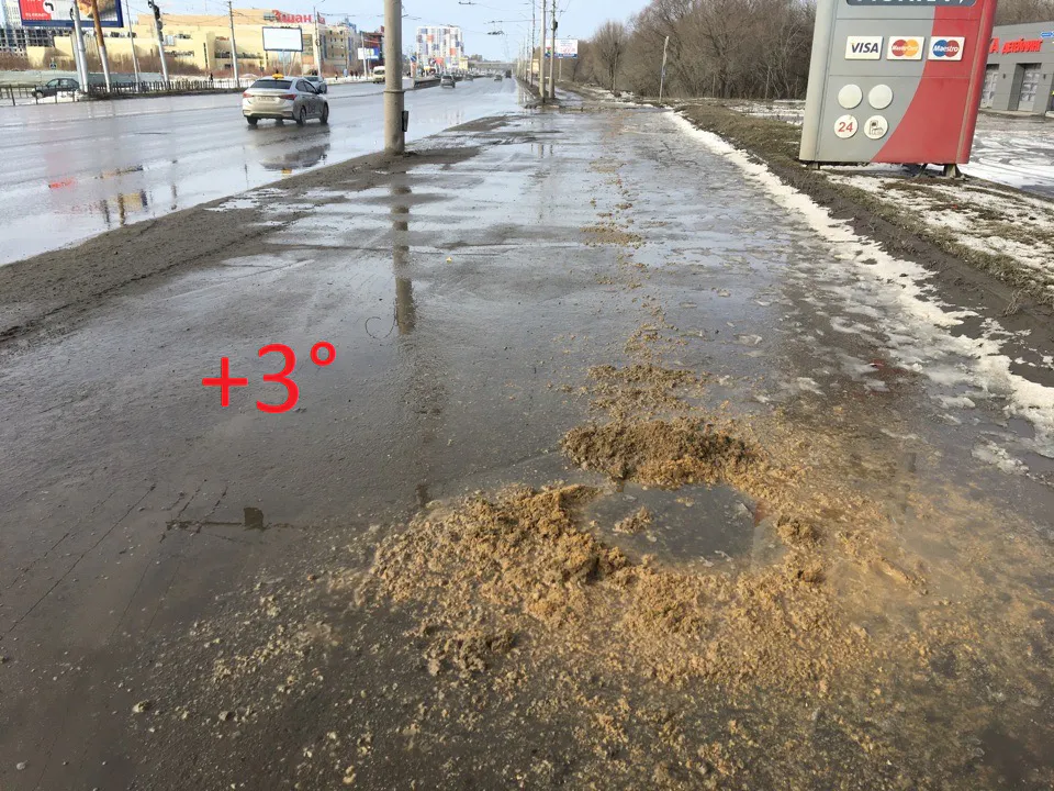 Еще вчера, 23 февраля, на улице была настоящая зима, но 24 февраля расставило все по местам - в Рязани снова весна. На тротуарах вместо льда сейчас можно встретить лишь лужи и грязь. А наш читатель нашел на Московском шоссе еще кое-что - песок, который должен защитить от падения на льду. Правда, льда там нет: