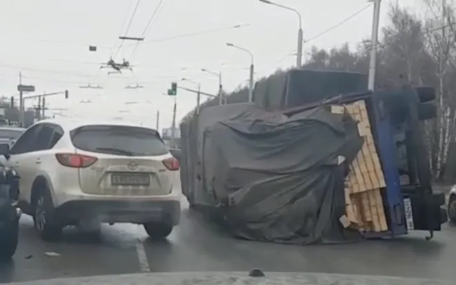 Вот это поворот: на Московском шоссе опрокинулся прицеп КАМАЗа