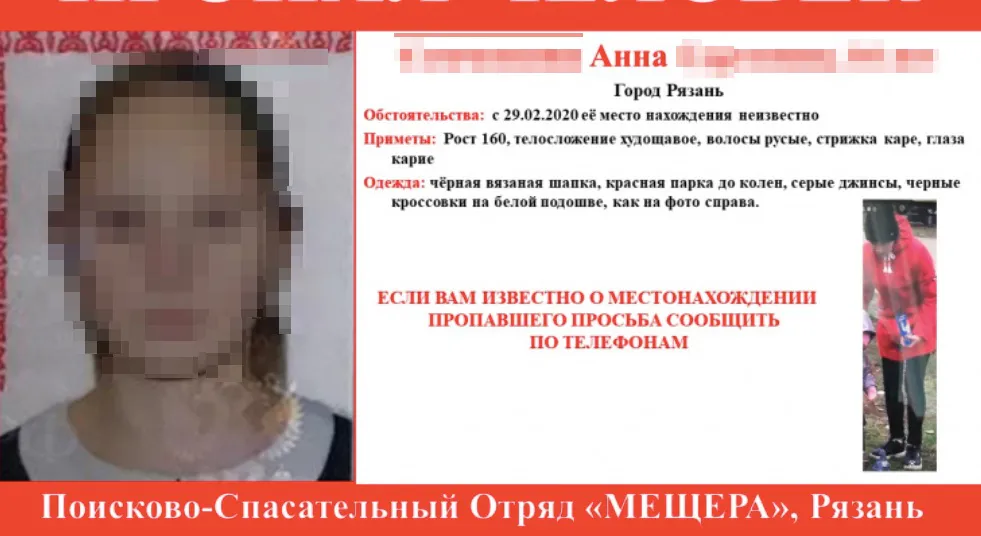 Поисково-спасательный отряд «Мещера» Рязань просит оказать помощь в поиске девушки Анны, которая пропала  29 февраля.