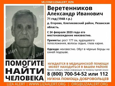 В Клепиковском районе Рязанской области объявили в розыск 71-летнего Александра Ветеренникова. Как сообщает поисково-спасательный отряд "Лиза Алерт", житель деревни Егорово пропал неделю назад, в понедельник, 24 февраля.
