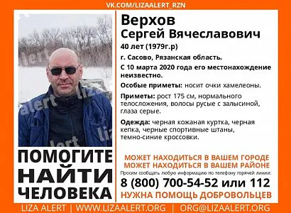 В Рязанской области объявили в розыск 40-летнего жителя Сасова Сергея Верхова. Его поисками уже занимаются волонтеры ПСО "Лиза Алерт". Как сообщают активисты, местонахождение мужчины неизвестно с 10 марта этого года.