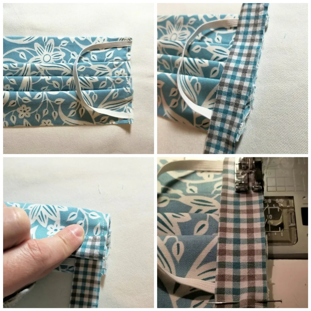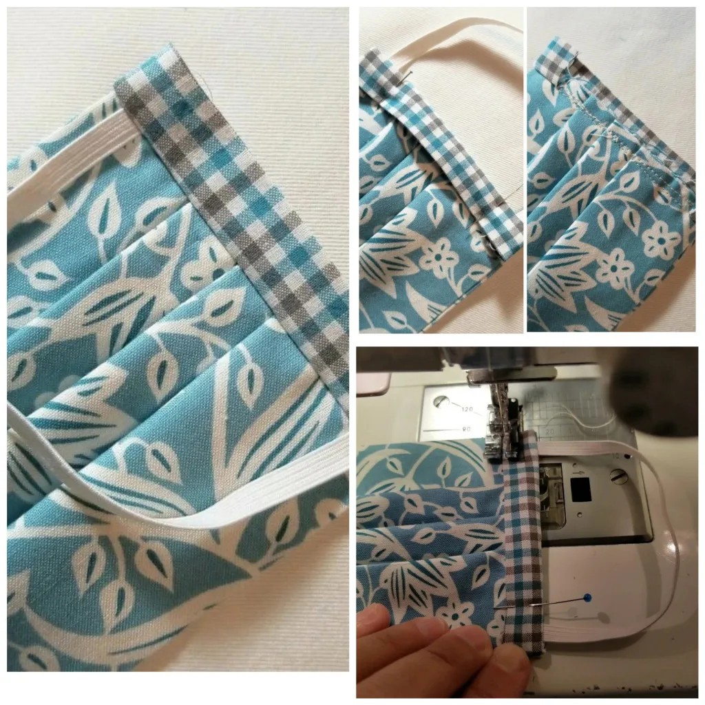 Прикалываем резинку к краям маски, полосочки для отделки складываем изнанкой и проглаживаем. Соединить полосочки, резинку и основание маски, чтобы необработанные края совпали. Заворачиваем концы полосочек. Закрепляем все это булавкой, а затем сшиваем, но отступив от края 0, 7 см.