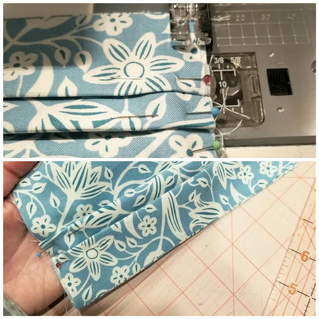 Потом самое сложное. Сгибаем края изделия по первой, а потом по второй линии, как показано на фото. Все метки должны совпасть, в результате, глубина складой получится около 1,7 см. Далее нужно прошить складки на машинке, если есть, или воспользоваться ниткой и иголкой.
