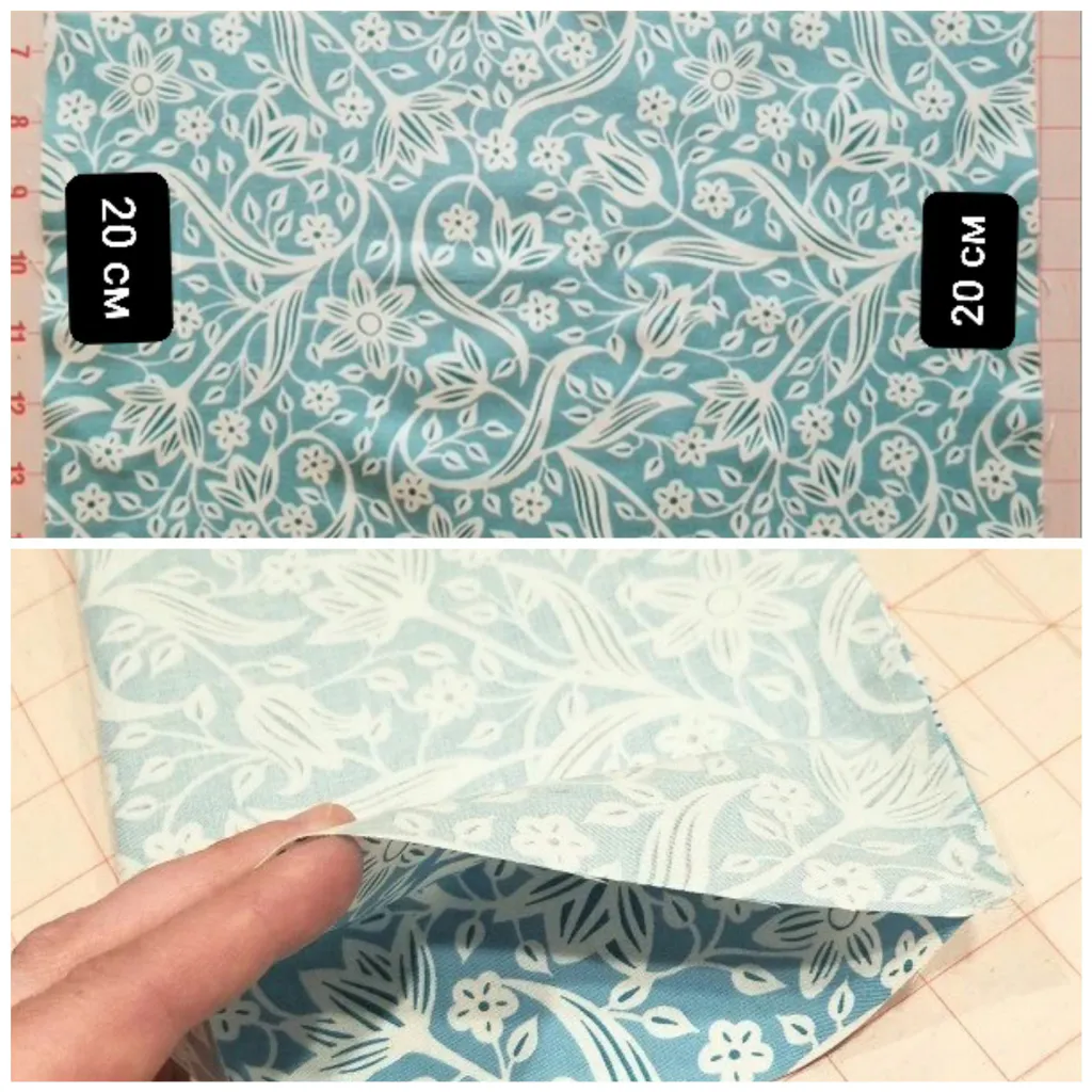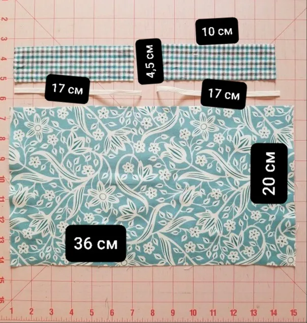 Вырезаем основную деталь 20 см в ширину 36 см в длину, 2 полоски 4,5 см ширина 10 см длина. Также отрежьте 2 куска резинки по 16−17 см каждый.