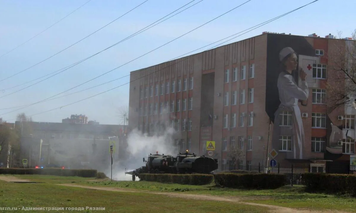 24 апреля в Рязани прошел следующий этап дезинфекции улиц, которую провели с помощью военной техники. Аэрозольная обработка прошла в Горроще, и пресс-служба администрации города опубликовала фотографии работы.